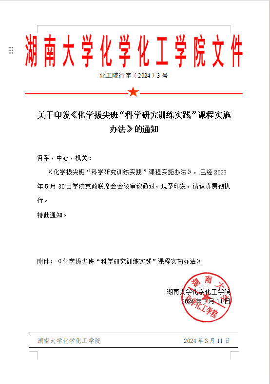 关于印发《化学拔尖班“科学研究训练实践”课程实施办法》的通知