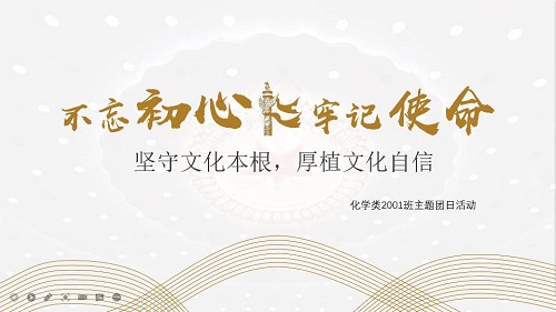 为学习贯彻“党的十九大精神”、新时期“两会”精神,认真领会“四个自信”,弘扬中华民族优秀传统文化,加强对团员的文化教育, 坚定学生理想信念和文化自信,使同学们在面对当今世界复杂多元的文化体系共存局面时,能够把握时代需求,科学辨识多元文化、继承发扬优秀传统文化,牢固树立道路自信、理论自信、制度自信和文化自信,化学类2001班积极响应学院要求,于2021年11月10日在研究院楼B103召开了“坚守文化本根,厚植文化自信”主题团日活动。本次团日活动由团支书邹洋洋同学主持,化学2001班全员参加。