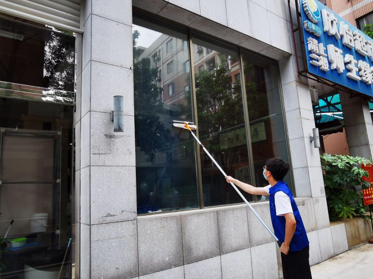活动伊始,同学们前往一食堂领取打扫工具,随后在食堂负责人的安排下开始打扫食堂卫生。同学们分工有序,餐桌和门等地方主要由女同学来进行打扫,窗户以及大门等较高的地方交给男同学来进行打扫。大家的合理分工使得本次活动在保证质量的前提下高效率地完成,桌面、大门以及窗户的边边角角在同学们打扫后焕然一新,这为食堂增添了夏日新气象,努力进行打扫的志愿者们也成为了食堂中一道亮丽的风景线。