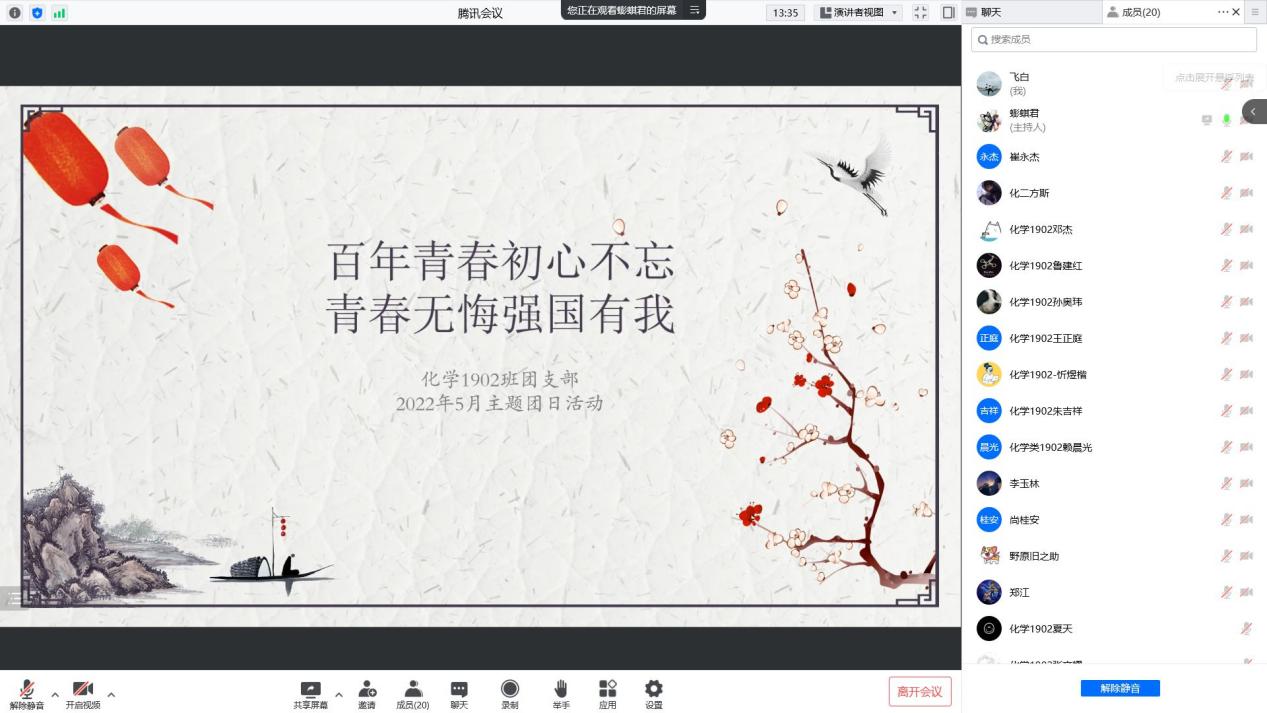 为重温五四精神,激发同学们奋发向上的昂扬意志,化学1902班于5月18日下午2点召开了题为“百年青春初心不忘,青春无悔强国有我”的主题团日活动,本次活动由团支书王鹏棋主持,以腾讯会议的形式开展。