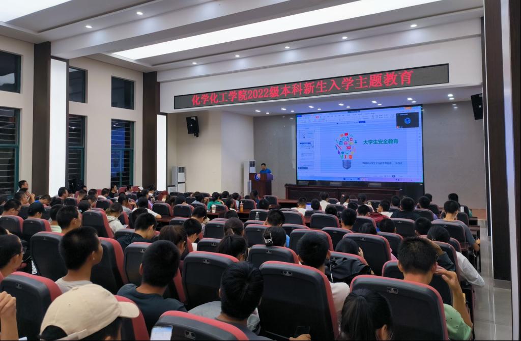 组织2022级本科同学们在新化工楼D区报告厅参加校园安全主题教育讲座,此次讲座邀请了学校保卫处张竞开老师主讲。