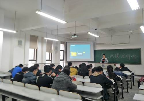 会议伊始,由班长符祖祺同学结合上学期的综合成绩进行分析,着重地分析了专业前二十名的人数分布情况以及班级挂科情况,并且将其同大一学年秋季学期的成绩情况进行比较,发现本班进入专业前二十名的人数有所上升,且名次靠前。符祖祺总结出的原因有班级学习氛围良好,同学们自觉性增强,老师们的鼓励和帮助等。但同时班级仍有13.8%的挂科率,他鼓励挂科的同学不要气馁,合理分配好时间,掌握合适的学习方法,希望所有的同学在新的学期能够再接再厉,取得更加优秀的成绩。