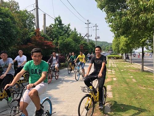 活动当天风和日丽,同学们为了更好地感受户外的风光,都决定骑行到达梅溪湖公园,一路上生机盎然,树木枝繁叶茂。同学们骑骑停停,用手机记录下户外的青葱景象。由于沉醉于这路上的美景,同学们都惊讶那么快就到了梅溪湖。在公园外,大家整齐地把自行车停在一起。进入公园后,开始了活动的主要内容——制作风筝。