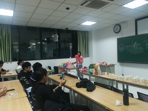 活动开始,高倩同学向大家介绍了第一轮的游戏规则。即全班同学分为四组,每一个小组成员都有一个气球,气球内部有一份关于生活中的化学小常识的题目。游戏开始时,其中两个小组成员之间分别展开争夺,率先踩爆对方气球,拿到题目,并回答出正确答案的小组得一分,累计得分最高的小组可以先行挑选礼物。最终,张琰峥同学所带领的小组率先夺魁。在这个环节中,大家懂得了更多的专业知识,也更好地提高了专业认知和学科自信,活动十分贴近“化学文化节”这个主题。