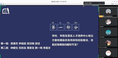 在会议开始前同学们自行分组并在“学校、学院在落实人才培养中心地位方面有哪些优良传统和经验做法,目前还有哪些问题和不足”、“对学校、学院在“落实人才培养中心地位”方面有哪些建议”、“作为学生干部\辅导员,谈谈如何立足本职岗位落实人才培养中心地位”等三个主题中选定心仪的主题后进行了组内讨论。
