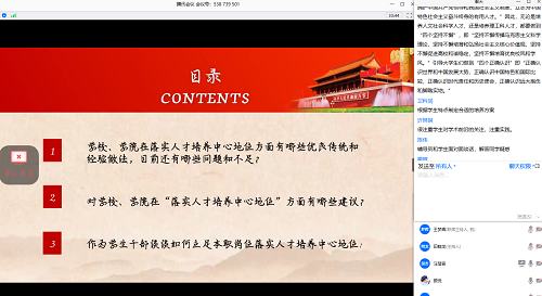 接下来,王梦辉同学邀请各位同学们发表感想,大家积极开麦交流,在关于学校、学院在落实人才培养中心地位的优良传统方面,纷纷发表自己的观点,并提出相关建议。比如田晓龙同学,他提出了自身关于教学的建议:“学校部分学科实行的‘先听课后选老师制度’使学生能够根据自身特性选择合适的课堂,有利于学业及发展,希望学校能够大力推广。”其次,同学们分享了自身对未来的展望,以及对自身人生成才之路的规划,在畅谈之中,大家都更加坚定了自己的理想与目标。