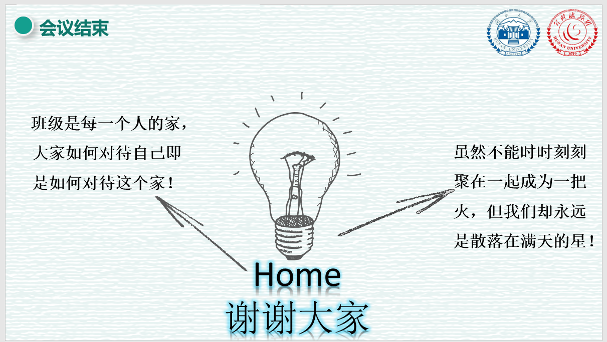 会议很快进入尾声,由丁涣同学对班会作了总结,并让大家记住:班级是每一个人的家,大家如何对待自己即是如何对待这个家。并强调了班级作为家庭的凝聚力和和对于同学们的归属感,希望理科试验班的同学们:聚是一团火,散是满天星。