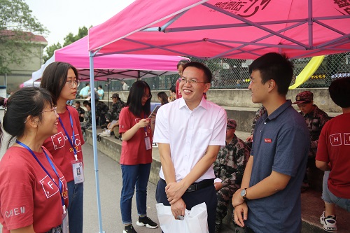 化学2003班班导师李昆老师,2004班班导师赵子龙老师和化工2003班班导师彭桑珊老师到军训场看望自己班上的同学。