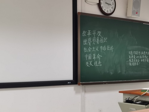 下午三点,团日活动正式开始。团支书李珂瑾首先在黑板上写下“四史学习,网上重走长征路”作为本次班会的标题。在声明本次班会“学好新四史,重走长征路”的主题后,团支书李珂瑾在班级学习群中分享了源自哔哩哔哩的视频 “‘四史’学习微团课,改革开放的历史”。该视频分为“改革前夜”、“改革与开放”、“改革开放的意义”三部分,描述改革开放为新中国带来的深刻转变。这种转变不仅在物质上,更在精神上。十分钟后,全体同学观看完毕,团支书李珂瑾又在黑板上写下五个词——“改革开放”、“世界贸易组织”、”社会主义市场经济“、”中国革命“、”发展理念”,抽取了三位同学用英文翻译,随后表示:“在即将到来的四级考试中,极有可能出现与新四史学习有关的翻译题,还请同学们回去都好好查一下这几个词的英文表达,在将来是很可能有用处的。”最后,团支书李珂瑾再次强调了线上学习新四史的重要性,以及对每日打卡学习的重视。下午3点30分,本次班会在同学们热烈的掌声中圆满结束。