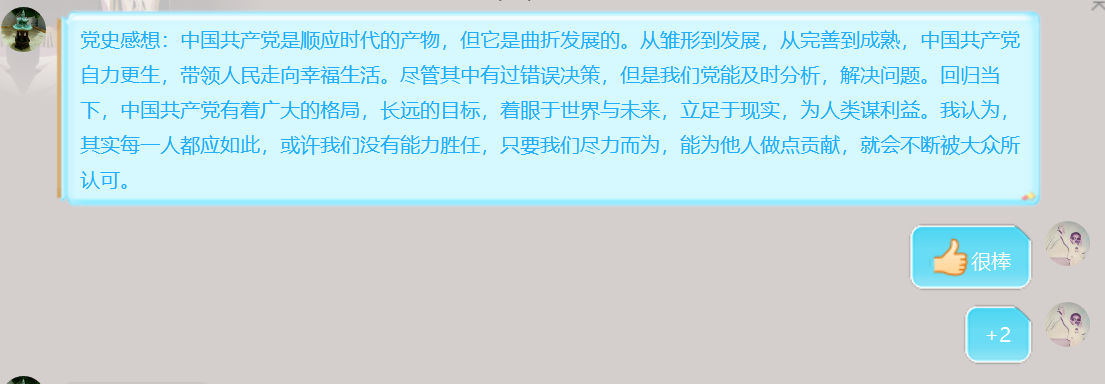 活动期间,同学们展现了高度的自主学习的积极性。完成团支书发布的学习资料之余,同学们从各大平台上补充学习四史相关视频,搜罗相关文字资料,身临其境地了解中国走过的峥嵘岁月,体会共产党在革命和奋斗中的艰难历程。同学们于2020年11月20日集中时间在班级群里交流讨论所学习的内容,胡灵龙同学和岳宏宇同学抒发个人学习感想,活动圆满完成。