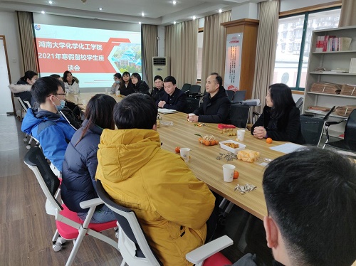 会议伊始,全体留校学生进行自我介绍,分享各自留校的原因,并发出新年愿望;院长张晓兵教授非常感谢各位同学关心学院的发展,舍弃寒假休息时间,为学院的发展做出贡献,并寄语全体同学:“今天你以湖大化工院为荣,明天湖大化工院以你骄傲”;院党委书记王玉枝教授询问同学们的生活是否可以得到保障,有问题可以及时向学院老师提出,希望同学们要做到安全有保障,祝愿同学们在长沙、在学校过一个欢乐、祥和、愉快的春节;院党委副书记潘刚峰老师向同学们介绍了学校给予留校学生的暖心服务,同时学院会给予留校同学最大的支持与关怀。