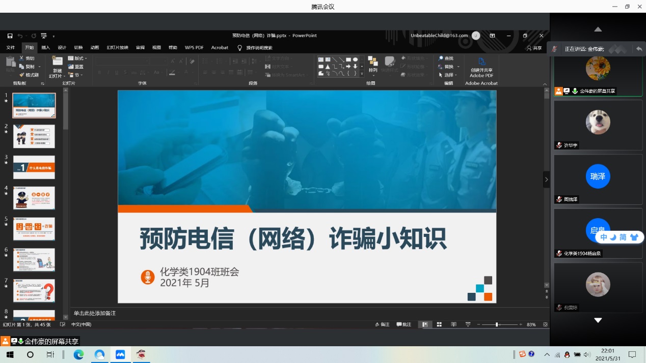 网络技术不断发展,网络诈骗手段层出不穷。为提高广大大学生的防诈骗意识,保护同学们的财产安全,化学1904班于6月6日星期一晚上22点整开展“预防电信(网络)诈骗小知识主题班会”线上主题班会。本次班会由化学1904班班长金伟豪同学主持,化学1904班同学悉数参与班会。本次班会分为四个部分,分别是介绍电信诈骗的定义、电信诈骗的常见形式、如何识别防范电信诈骗及上当后的补救措施。