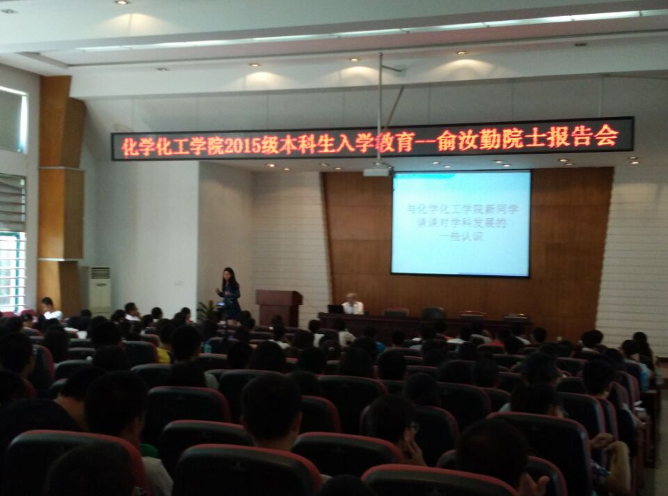 2015年9月29日,读漫屋 组织邀请俞汝勤院士为2015级新生开展入学教育讲座。陪同的有院党委副书记陈义红老师和15级新生辅导员刘卓老师。化工院学生早早来到报告厅占座,希望与院士更近一些,聆听院士的教诲。
