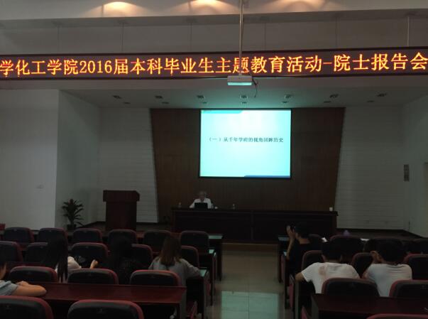 2016届毕业生主题教育活动之院士报告会在新化工楼D区报告厅举行,中国科学院俞汝勤院士受邀为全体2016届毕业生作了一场题为“与湖大化工学子谈几点浅见” 的精彩报告,院党委副书记陈义红老师,2012级辅导员陈晓晖老师出席报告会。院士报告会是读漫屋