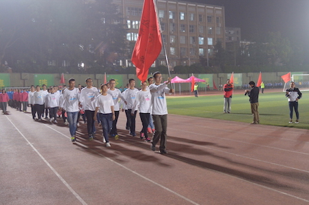 晚上,在精彩的武术表演和爵士舞蹈之后,校运会运动员方阵正式入场。方阵囊括了国旗方阵、包括化工院在内的各学院方阵以及机关方阵。化工院的同学们则统一穿着画有化学元素图案的白色文化衫,女生衣服的图案为粉色的镁元素Mg,男生的则是蓝色的氢元素H,这些图案的设计象征着化工院的青春活力。迎着秋风,同学们迈着矫健的步伐走向主席台。随着方阵中的一位同学的引领,方阵的运动员们齐声喊出:化工化工,谁与争锋!嘹亮的口号,昂扬的斗志,彰显化工院的蓬勃朝气与满腔热血。经过主席台时,队列变为象征化工院的“工”字型方阵,队伍中央的同学们则是挥舞着气球,代表着同学们对之后化工院运动员们勇创佳绩的期待。方阵里的同学们精神饱满,步伐整齐,将化工院的非凡气势展现得淋漓尽致。此次方阵更有化工院的领导老师们的共同参与入场,有了他们的洪亮的口号声,相信化工院的运动健儿们定会勇往直前,获得骄人的名次!