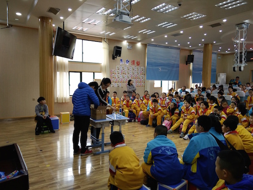 另一边前往仰天湖小学的志愿者们在和学校负责人取得联系之后就开始了对教室的布置和实验药品的准备。首先志愿者们用水和酒精3:2浸泡过的纸巾演示了“烧不破的纸巾”实验,同学们看到“清水”浸泡过的纸巾在剧烈燃烧之后没有损坏的奇特现象后,展开了合理的猜测和激烈的讨论,而志愿者们则将这些有趣的实验现象中所蕴含的科学知识一一解释给同学们听。接着志愿者们又演示了另外两个实验,“蓝瓶子”让同学们认识了亚甲基蓝和亚甲基白,“变色茶水”则让同学们了解到鞣酸,铁离子和草酸的相互作用。志愿者们把枯燥无味的科学道理用实验的形式表现出来,充分激发了小学生们对科学知识的热情。