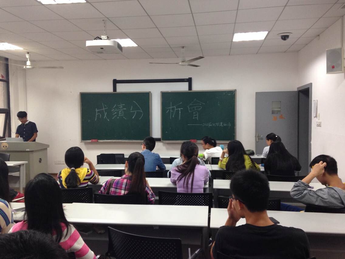 班会由现任班长汤嘉卿主持,开场班长强调了大三这一年的关键,对自己负责。大三一年无疑是最最关键的一年,满弓的箭只有找准自己的方向才能射准红心。不管是考研,保研,就业,出国,都需要明确自己的目标并为之踏实奋斗!接着,请原班长李延赛对我们班上一学年的学习和活动做了一个总结。我们一起举行“岳麓书院”活动,一起骑车去洋湖湿地,一起自习,一起合唱……其中,有值得肯定的,也有不尽如人意的。然后,就是重头戏——成绩分析。成绩分析由学习委员潘琪汇报了一下大概情况,没有具体到所有学科,特别提到:我们的核心课程是弱势,平均分相对较低,核心课程应该成为我们今后需要重视的重中之重。为了解大家的平时学习情况,学习委员请结构化学课代表陈展翔同学讲了一下平时作业的情况,意在提醒大家要重视每一次的作业。后来,请我们班的学霸王崇磊讲了自己的学习方法,考霸刘璐也详细叙述了自己的备考经验,大家都受益匪浅。