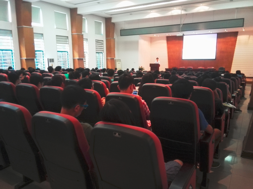 16点半不到,大家就早早的来到化工院报告厅就坐,等待大会的开始。大会由应化二班的王楚晴同学主持。在介绍了到场嘉宾后,很快进入大会第一项:成绩分析。副年级长郑祥同学为大家简单分析了下学期的成绩情况,普遍同学成绩比较集中于70-80分。同时分析了全年级9个班级大二上下学期的成绩情况,通过对比,发现总体来说大家是有进步的,每个班级下半学期的成绩普遍比上半学期的优秀,挂科率明显减小,郑也对大家一学期的努力表示了肯定。