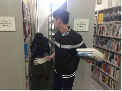 与老师接洽后,大家迅速得到了第一项任务——移动书籍。8位同学排成接龙队形,将书籍从原位置搬到另一个书架。刚开始大家都还有点生疏,有时速度掌控不好,搬运“流水线”偶尔停滞,但随着大家对工作渐渐熟悉,一个个书架的书本被迅速有序的运走。老师对我们的效率进行了表扬。