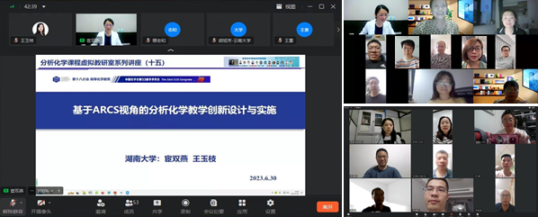的宦双燕教授为主讲嘉宾,她报告的题目是:基于ARCS视角的分析化学教学创新设计与实施,来自分析化学课程虚拟教研室和化学类专业基础理论课程虚拟教研室的75位教师参加了本次线上会议。