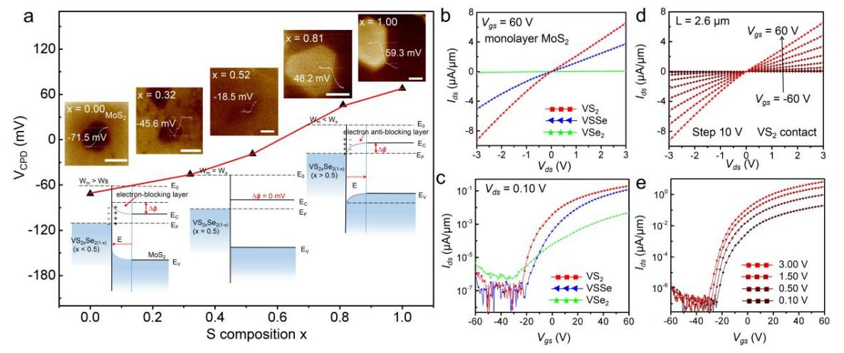 图4. VS2xSe2(1-x)/MoS2 vdWH FET的KPFM测试和电学特性。