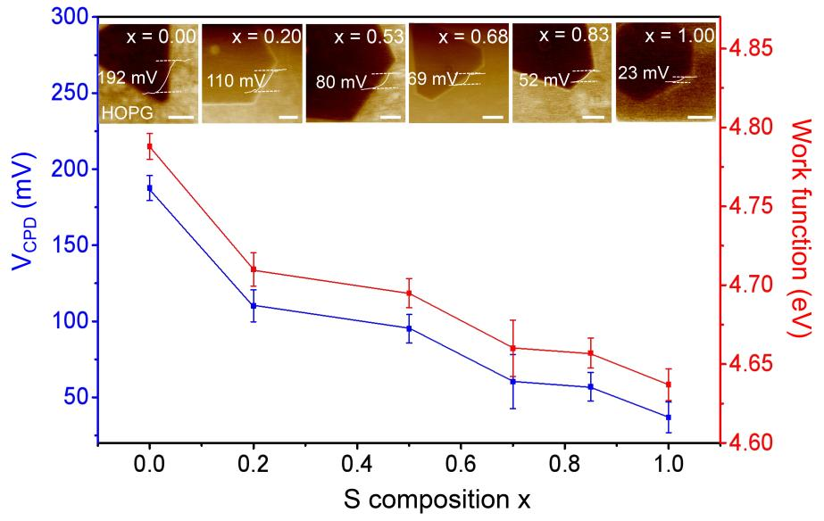图2. 不同合金组分VS2xSe2(1-x)纳米片在HOPG基底上的KPFM表征。
