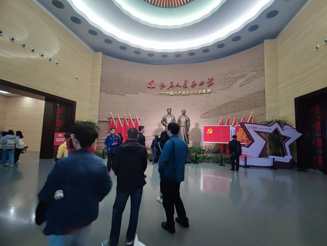 上午8:10,同学们在五食堂前集合签到并领取活动所需物资,然后一起乘坐大巴前往长沙党史馆,同学们在参观党史馆的同时寻找“寻宝打卡点”完成打卡任务,完成打卡任务的同学起(终)点工作人员处登记排名,活动结束后于进门处毛主席像处合影留念。