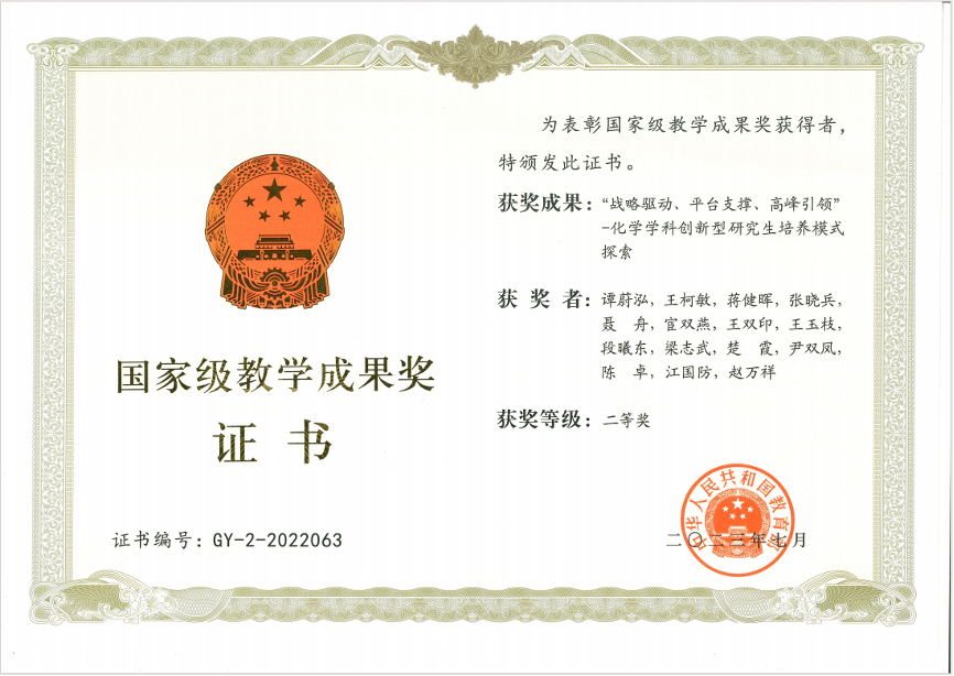 获奖成果:“战略驱动、平台支撑、高峰引领”-化学学科创新型研究生培养模式探索。