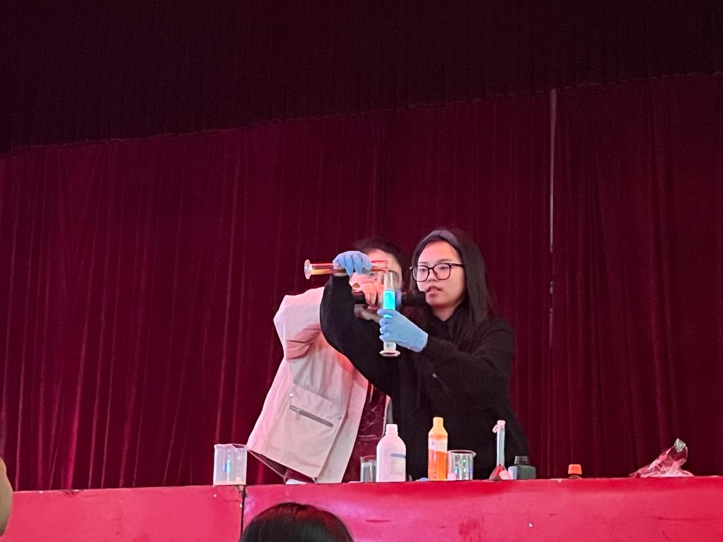团委书记蒋晓洁老师带领5名学院青年志愿者协会的学生在现场进行了趣味化学实验展演。