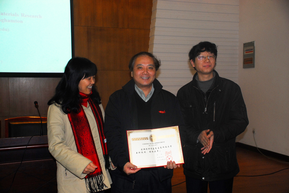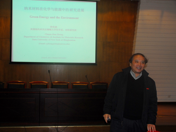 蒋健晖院长和王玉枝书记颁发聘书。之后,钟教授作了题为“纳米材料化学和能源中的研究进展”的学术报告,钟教授就合金纳米粒子的制备和应用,纳米结构的表征,及相关理论的研究进展作了较为详细的介绍,与会人员听完报告后给予了很高的评价,他的学术报告对与我校同行间的学术交流起到了良好的效果,也使我校同行专家对纳米化学研究现状和水平有了更充分的了解。