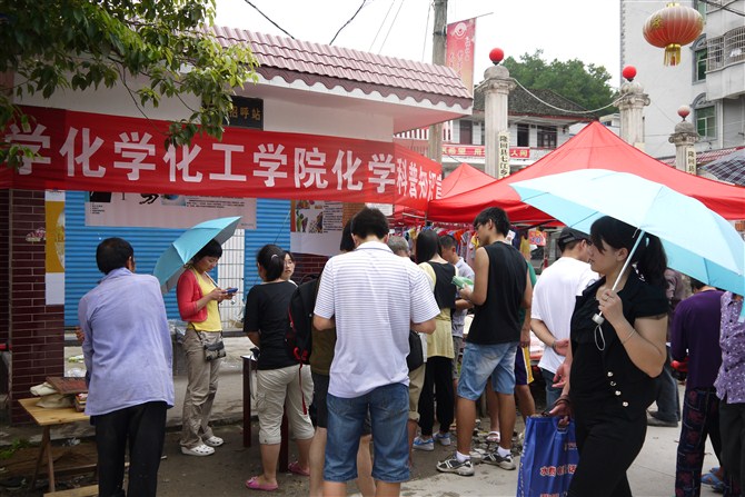 其中让人很感动的是一些老年人,他们有的不会写字,而且我们也听不太明白他们的当地方言,但是他们同时运用肢体语言,努力表达他们自己的观点,由我们代笔写下他们自己的想法,我们的队员也不顾烈日当空,站在大太阳底下向往来的群众宣传党史化学知识,在我们大家的努力及当地政府的支持下,我们的宣传活动取得了很好的效果。