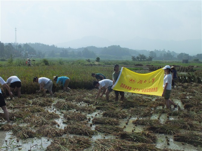 暑期“三下乡”社会实践团队一行人在乡政府工作人员的带领下早早来到了田间地头,开展为期半天的水稻收割工作,志愿帮助当地村民开展农事活动,体验生活和劳作。