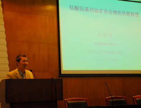 应国家重点实验室邀请,2012年10月14日,教育部****特聘教授,国家****科学基金获得者,北京科技大学物理化学系邢献然教授来读漫屋 讲学,作了题为“铅基负热膨胀化合物的合成和性能研究”的学术报告,受到了广大师生的热烈欢迎,俞汝勤院士主持学术报告。