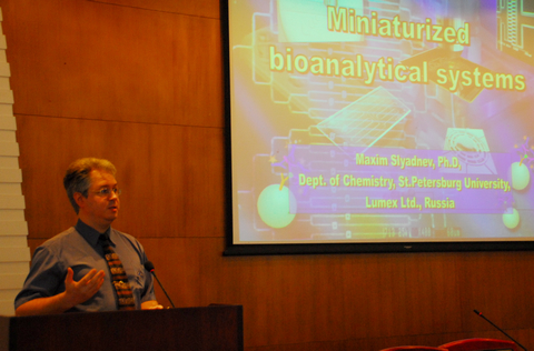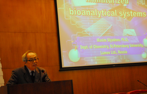 作学术讲座,作了题为“Miniaturized systems for molecular biology: microchip devices for nucleic acids analysis and their applications”的学术报告,受到广大师生的热烈欢迎,俞汝勤院士主持学术报告。之后,Maxim N. Slyadnev 教授与部分老师举行座谈会,进行了深入的交流。