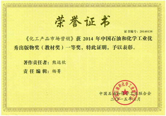 熊远钦老师主编的教材《化工产品市场营销》获2014年度中国石油和化学工业联合会优秀出版物奖(教材奖)一等奖。