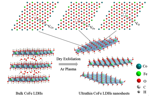 寻找清洁,可再生和可负担得起的能源技术是替代化石燃料的关键,氢能源由于其高的能量密度而被广泛应用于各行各业。电催化分解水产氢是非常有前景的产氢方法之一,氧析出反应被认为是电催化分解水的决速反应。氧析出反应是一个多步骤、四电子过程的上坡反应,其反应动力学差,过电势高。因此,发展高效廉价的氧析出反应电催化剂至关重要。体相层状双金属氢氧化物由于其独特的二维结构、大的比表面积以及其特殊的电子结构显示出良好的电催化性能,其用于OER已有了广泛的研究。但是,大的颗粒尺寸和颗粒的厚度限制了电催化活性位点的暴露从而抑制了其OER的电催化活性。该课题组利用等离子体技术处理体相钴铁双金属氢氧化物纳米片 (CoFe LDHs),干法剥离得到超薄的二维纳米片。该课题组首次发明了利用Ar等离子体干法剥离体相层状双金属氢氧化物。与传统的液相剥离相比,氩气等离子体剥离表现出干净、省时、无毒的优势,同时避免了液相剥离时溶剂分子的吸附。剥离得到的纳米片能够以粉末的形式稳定存在。与此同时,剥离所得的二维超薄纳米片被观察到有多种类型空位的形成,富含氧空位,钴空位和铁空位。这些多空位的位点具有更高的电催化活性,更加利于吸附H2O及其中间产物发生反应从而产生氧气。与体相CoFe LDHs相比,等离子体干法剥离所得的二维超薄CoFe LDHs纳米片,具有更大的比表面积,暴露出更多的活性位点催化OER,更为重要的是,多种空位的产生更加有利于催化OER。总的来说,该课题组首次通过一步等离子体对体相CoFe LDHs纳米片进行干法剥离,形成富含多种空位的二维超薄纳米片材料,该材料作为OER催化剂显示出及其优秀的电催化性能。
