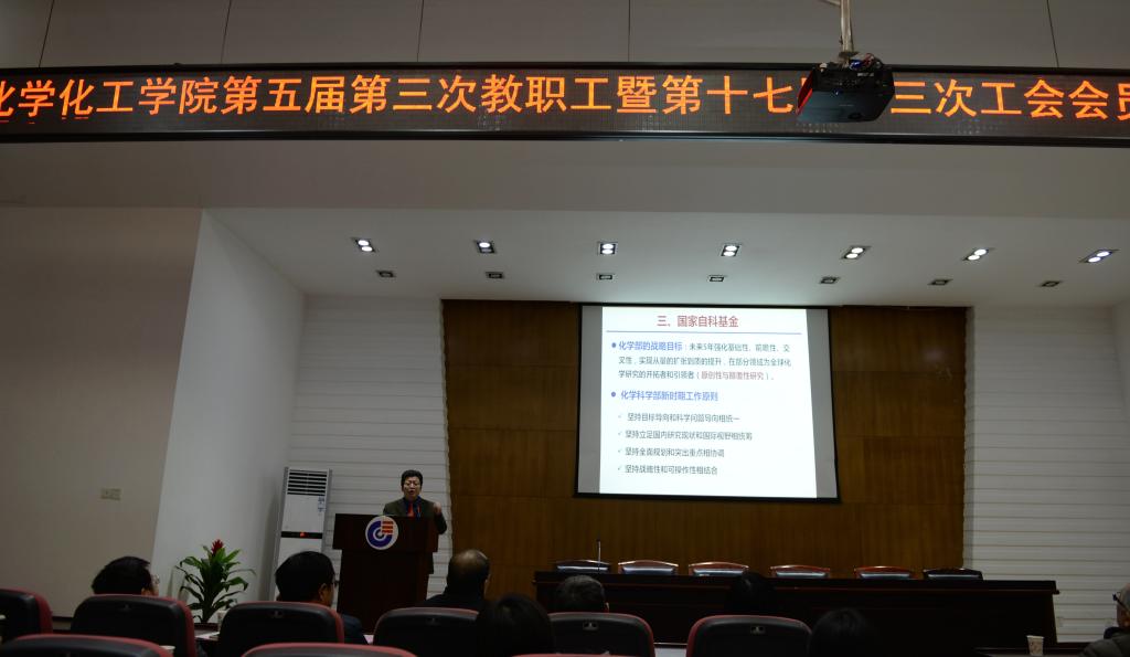 紧接着,蒋健晖院长作题为《乘“十九大”东风,借“双一流”契机,全面推进一流学院和一流学科建设》学院工作报告。报告就2017年学院工作进行回顾与总结,在突出业绩方面,实现NSC(Nature、Science、Cell)论文零的突破,学科排名进步显著,新增省部级科技成果奖一等奖等等;人才培养质量稳步提高,学科综合实力持续提升,师资队伍建设卓有成效,科技研究工作亮点突出,国际交流合作成效显著,党建思政学工不断拓展,管理服务效能不断提升;同时也指出学院2017年工作中存在的问题和困难,对学院2018年的部分重点工作及目标进行简要介绍。蒋院长还做了学院财务工作报告,对学院2017年度财务工作进行了简要汇报。与会教职员工对学院年度工作的满意度进行评价并投票。