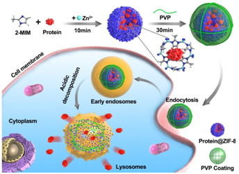 细胞内蛋白质递送在疾病治疗、基因工程以及合成生物学领域有着重要的意义。目前的蛋白质递送系统通常依赖于基因蛋白与膜穿透性标签的融合以及基于阳离子脂质体、聚合物、无机纳米材料的蛋白包封载体。但是,基因融合系统并不适用于天然的、非融合的蛋白质的递送。而纳米载体往往需要对蛋白质进行共价修饰,蛋白质的装载和溶酶体逃逸的效率较低。