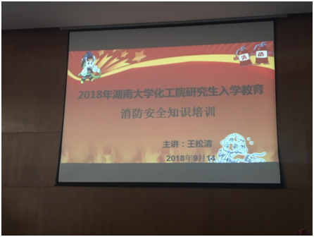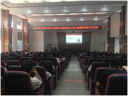 于新化工楼D区报告厅举行了2018级研究生入学主题教育之消防安全与消防演习。本次消防安全讲座的主讲人是长沙市湘安消防公益服务中心的王松清王教官,同时得到校保卫处的大力支持。