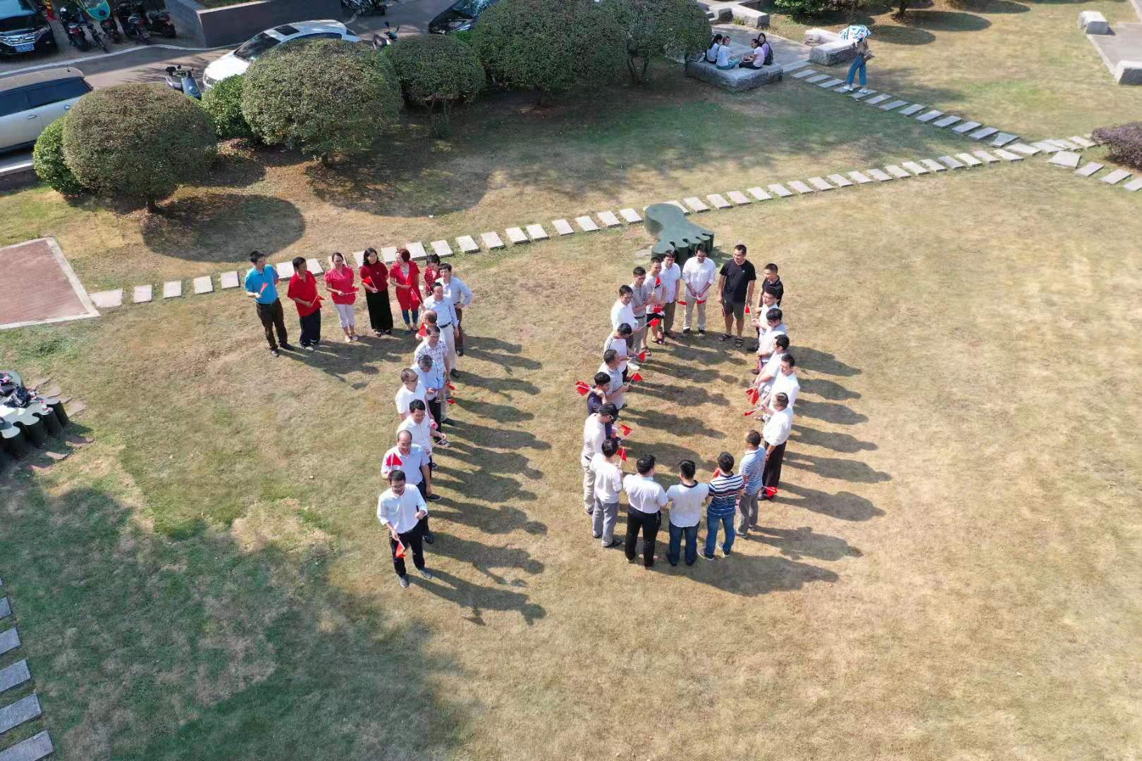 有机化学和物理化学学科的39位老师参与了此次活动。他们心情澎拜,挥舞着国旗,大声喊出“我爱您 祖国”和“祝祖国繁荣昌盛”等,此时此景,虽然热烈,却难以表达大家对祖国的热爱和祝福。最后,大家排成70的字样,以祝福中华人民共和国七十华诞,并用无人机记录下这美好的一刻。