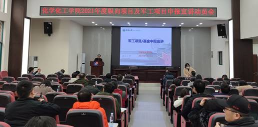 2021年度纵向项目及军工项目申报宣讲动员会在新化工院D区大报告厅举行。会议由副院长梁志武主持,院长张晓兵、科学技术研究院院长尹双凤,副院长兼军工办主任周炎涛、基础办主任唐晖等出席会议,学院80余位教职员工参与研讨。