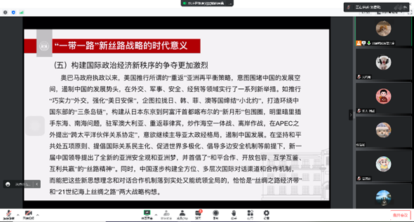 2022年11月2日晚,ICBN02党支部以“讲中国故事、青年有约”为主题,邀请了支部党员夏杭同志作为本次会议主讲。会上,夏杭同志细致地讲解了“一带一路”倡议的由来、提出、发展及成果,也分析了“一带一路”目前所面临的困难。