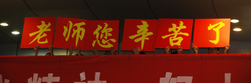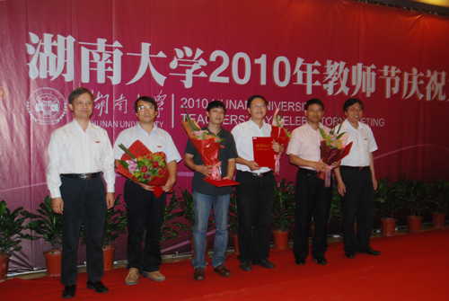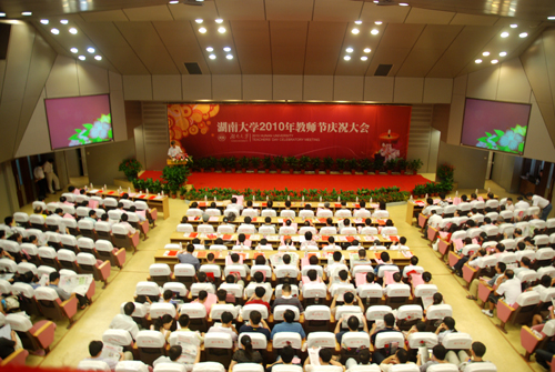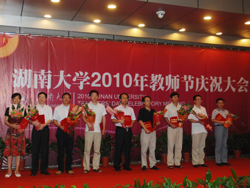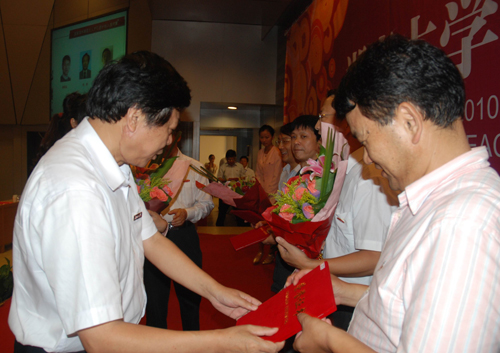 9月7日,在第26个教师节到来前夕,我校在逸夫楼隆重举行庆祝2010年教师节暨表彰大会。一批在教学、科研、管理等方面做出突出贡献的教职员工受到表彰和奖励。学校发起向读漫屋 蔡炳新教授学习的号召。全体在校校领导出席会议并为优秀教师和先进团队颁奖。