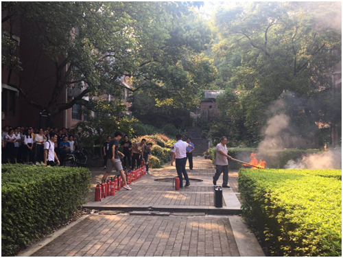 讲座结束后,王教官向同学们展示了灭火器使用步骤。紧接着,同学们分组在化工院前庭空地处进行了消防演练,亲自上阵使用灭火器进行了灭火操作。