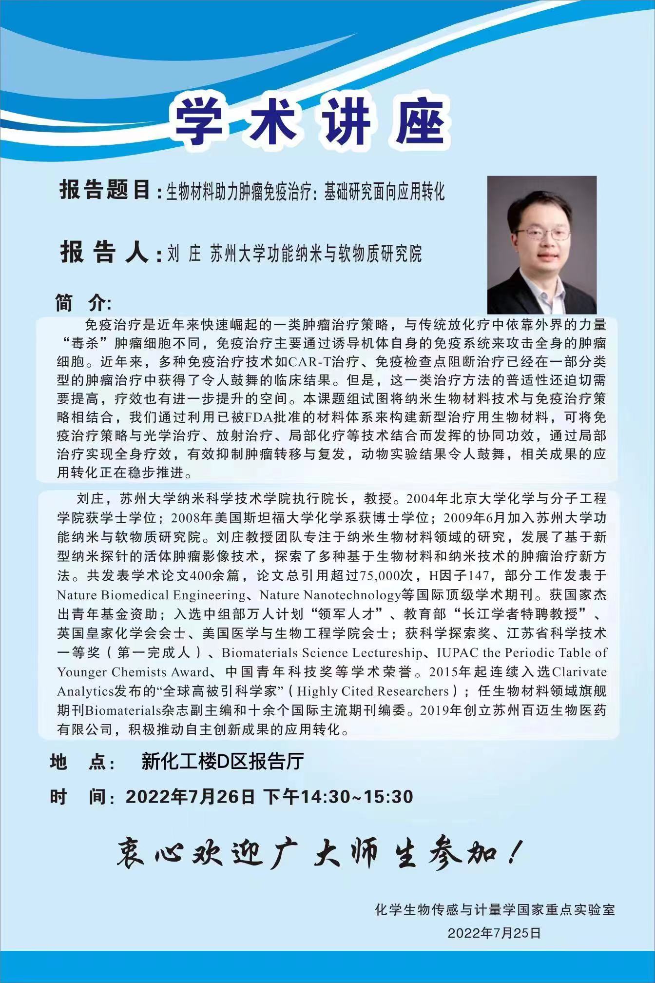 2022年7月26日苏州大学功能纳米与软物质研究院刘庄教授学术报告会