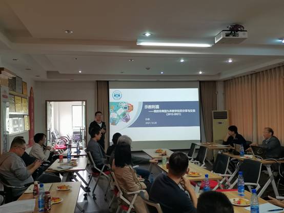许峰老师分享了他九年来的教学经历,从教学态度、教学准备、课堂形式与组织等多方面进行了交流,并与在座老师们分享了他的一堂教学展示课的制作思路。