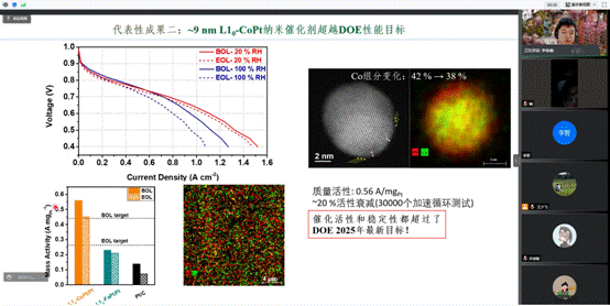 美国华盛顿州立大学李俊睿博士作了题为《Well-defined nanomaterials for fuel cells and catalysis》的学术报告,主要探讨通过化学合成方法在实现对纳米材料制备的精确调控基础上,开展关于原子级别结构调控和表面应力调控对催化剂性能影响的构效研究,成功构建了性能优异、具备在实际运行条件下工作的高效稳定的燃料电池纳米催化材料。
